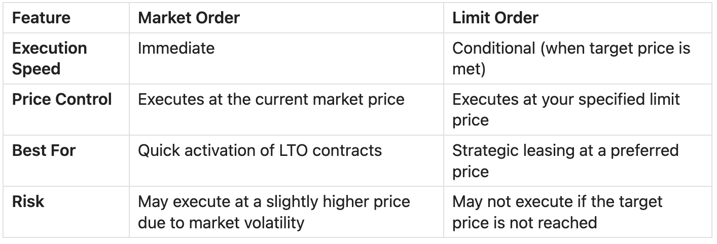 A Limit Order allows you to set a target price at which your LTO contract will activate. The contract will only execute if the market price reaches or falls below your specified limit price.