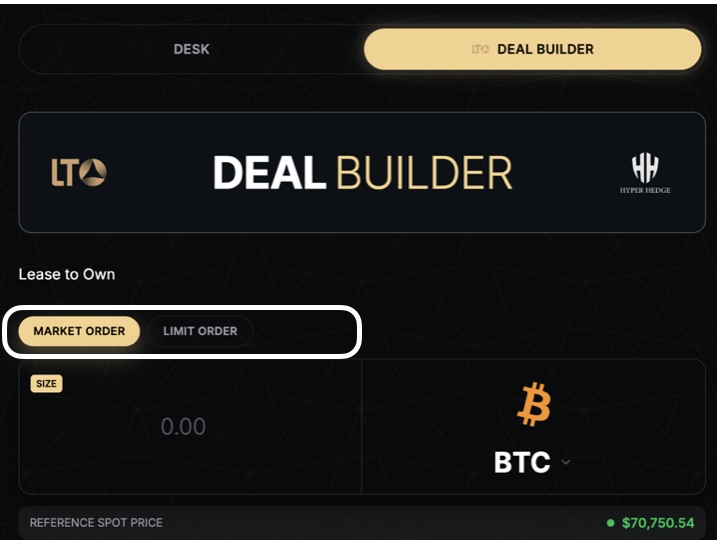 The LTO Deal Builder on BitLease allows users to create Lease-to-Own (LTO) positions with two order types: Market Order and Limit Order. These options provide flexibility in how you initiate your LTO contracts, depending on your strategy and market conditions.