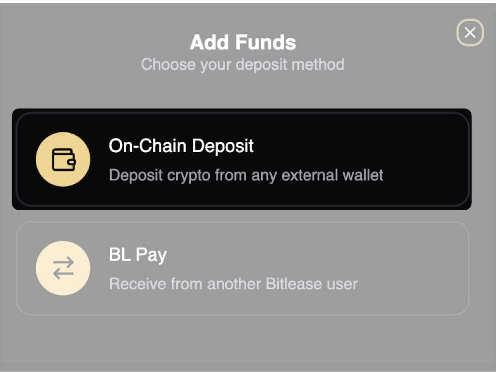 On-Chain Deposits allow you to transfer cryptocurrency from external wallets directly to your BitLease FUNDING wallet using blockchain networks.