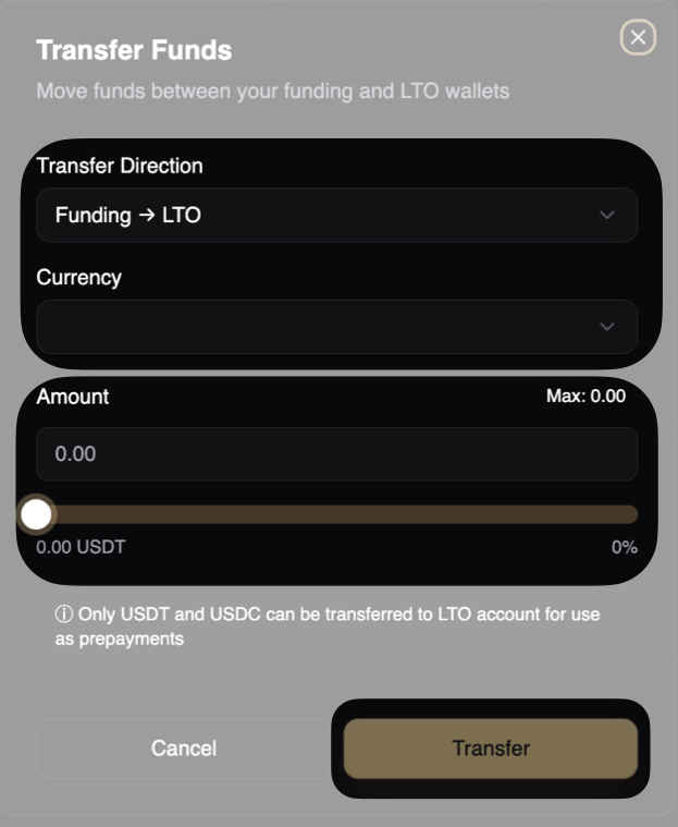 Internal Transfers: Move funds between your FUNDING and LTO wallets.